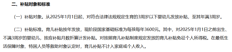根據(jù)新發(fā)布的《育兒補(bǔ)貼方案》,自2025年1月1日起,每個(gè)孩子(不限孩次)每年可領(lǐng)取3600元補(bǔ)貼,直至年滿3周歲。這標(biāo)志著國家開始向全國有嬰幼兒的家庭發(fā)放育兒現(xiàn)金補(bǔ)貼,減輕家庭養(yǎng)育負(fù)擔(dān)。那么,不滿3周歲的孩子都能申領(lǐng)嗎?具體如何申領(lǐng)呢?